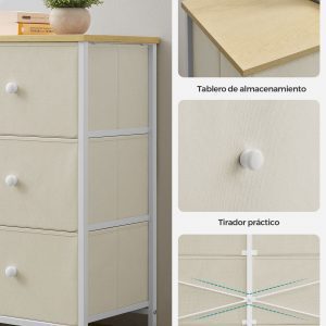 Construida con una sinergia de materiales que incluye tela no tejida, acero resistente y madera de ingeniería, esta cómoda es tanto estable como duradera, sin sacrificar la ligereza. Preparada para albergar tu creciente colección de ropa, cada cajón soporta hasta 3 kg, mientras que el tablero superior tiene una capacidad de 15 kg, perfecto para decoraciones o necesidades diarias.