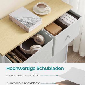 Con su elegante mezcla de colores gris claro y blanco, esta cómoda no solo es funcional sino también un complemento decorativo encantador para cualquier habitación. Los pomos de madera maciza añaden un toque de calidez y sofisticación, convirtiéndola en la pieza central perfecta que combina con cualquier decoración.