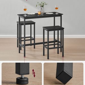 Este conjunto no solo se destaca por su estilo, sino también por su funcionalidad. Equipado con una barra de soporte, dispositivo de fijación y patas ajustables, asegura una estabilidad incomparable, ya sea que se utilice para desayunar, tomar algo por la noche, o incluso trabajar desde casa. Su diseño versátil se adapta perfectamente a la cocina, sala de estar, o dormitorio.