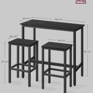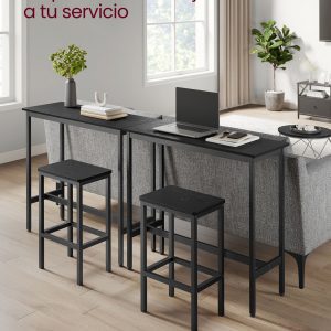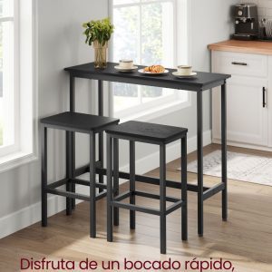 Imagina comenzar el día en un espacio diseñado especialmente para disfrutar de los momentos más placenteros, con una mesa alta de 100 x 40 cm perfecta para compartir café, croissants, y zumo. Los taburetes, de 30 x 40 cm, ofrecen el asiento cómodo ideal para dos, haciendo de este conjunto la adición perfecta para cualquier cocina o área pequeña.