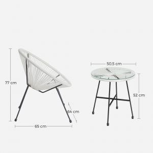 La solidez de este conjunto se basa en sus patas de acero macizo, resistentes al óxido, y en las cuerdas de PE, que juntas soportan hasta 130 kg por silla. La mesa auxiliar, con su tapa de cristal templado, es capaz de sostener hasta 60 kg, garantizando estabilidad y seguridad para tus bebidas y decoraciones.