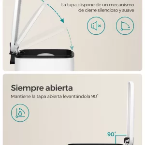 Cierre Lento y Apertura Constante: La tapa se cierra de manera suave y silenciosa, evitando ruidos molestos. También cuenta con la opción de mantener la tapa abierta, lo que facilita la eliminación continua de residuos cuando sea necesario.