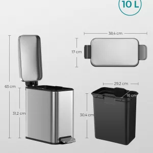 Este cubo de basura para baño de 10 litros es la solución perfecta para mantener tu baño limpio y libre de desorden. Diseñado con un perfil delgado de 38,4 x 17 x 35 cm, se adapta perfectamente a espacios pequeños, ofreciendo una gran capacidad sin ocupar demasiado espacio en el suelo. Fabricado en acero resistente al óxido, este cubo es ideal para cuartos de baño húmedos, garantizando que el interior permanezca seco y libre de olores.