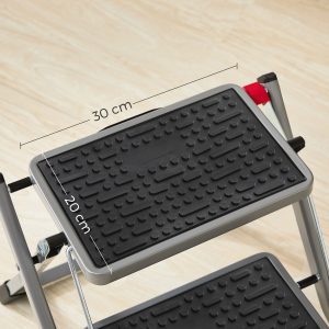Diseño Seguro y Antideslizante: Equipada con un dispositivo de bloqueo automático para prevenir accidentes, escalones profundos de 20 cm cubiertos de goma y patas con tapas antideslizantes para un uso seguro en cualquier superficie.