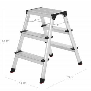 Eleva tu eficacia en tareas de mantenimiento, decoración y limpieza con nuestra escalera doble. Con 3 peldaños a cada lado y una altura máxima de 62 cm, esta escalera es la compañera ideal para una amplia gama de actividades, desde albañilería hasta la pintura y más.