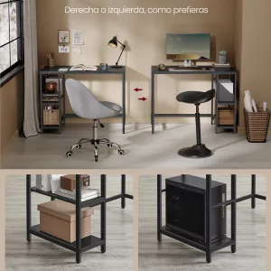 Estantes Flexibles: Este escritorio cuenta con 2 estantes, uno de los cuales es extraíble y puede instalarse a la derecha o a la izquierda, según tus necesidades. Puedes quitar el estante del medio para hacer espacio para tu torre de ordenador, o mantenerlo para libros, archivos u otros artículos de uso frecuente, proporcionando flexibilidad y organización a tu espacio de trabajo.