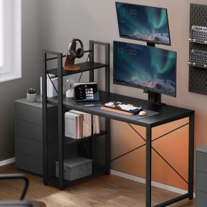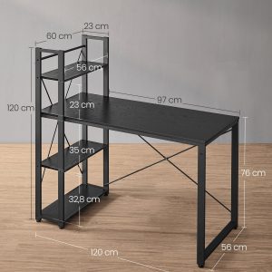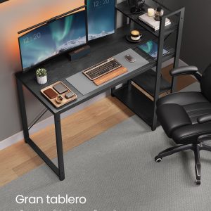 Con dimensiones de 56 x 120 cm, nuestro escritorio ofrece suficiente espacio para acomodar hasta dos monitores, lo que lo hace ideal para configuraciones de juego, estaciones de trabajo múltiples o simplemente para tener un amplio espacio de trabajo. Los niveles adicionales de la estantería brindan un almacenamiento conveniente para tu cuaderno, carpetas y otros materiales esenciales, manteniendo todo al alcance de la mano.