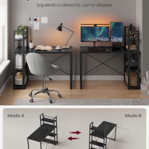 Este escritorio innovador viene equipado con un estante que puede ser instalado tanto a la derecha como a la izquierda, permitiéndote personalizar tu estación de trabajo según tus preferencias y las limitaciones de espacio. Esta flexibilidad asegura que siempre tendrás acceso fácil y rápido a tus materiales de trabajo o estudio, independientemente de la configuración de tu habitación.