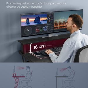 Soporte para Monitores que Promueve la Salud: Con un soporte para 2 monitores a la altura de los ojos, este escritorio reduce la tensión en el cuello y la espalda durante largas horas de juego o trabajo. Además, cuenta con un compartimento inferior para organizar y liberar espacio en el escritorio.