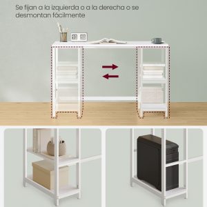 Estantes Flexibles: Con 2 estantes, uno de los cuales es extraíble y puede instalarse tanto a la derecha como a la izquierda, este escritorio se adapta perfectamente a tus necesidades. Remueve el estante del medio para acomodar tu computadora o mantenlo para organizar libros, archivos y otros artículos de uso frecuente.