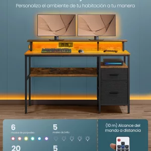Eleva tu experiencia de juego o trabajo con nuestro escritorio de juegos diseñado para la máxima funcionalidad y estilo. Equipado con iluminación LED integrada que ofrece 20 colores, 6 modos de parpadeo, 5 niveles de brillo y 5 velocidades de parpadeo, este escritorio permite personalizar el ambiente a tu gusto. Además de su funcionalidad luminosa, el escritorio cuenta con amplio espacio de almacenamiento, incluyendo un cajón grande, un cajón para carpetas y un espacio abierto para libros.