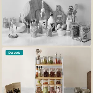 Este especiero de 3 niveles es más que un simple mueble; es una invitación a organizar tu espacio de cocina de manera eficiente y con estilo. Ideal para cualquier entusiasta de la cocina que valore tanto la funcionalidad como la estética. Desata tu creatividad culinaria con orden y elegancia.