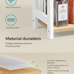 Este no es un estante ordinario. Construido con bambú de alta resistencia y madera de ingeniería, nuestro especiero promete ofrecer un soporte duradero y estable, asegurando que tus especias, aceites y otros esenciales de cocina estén siempre al alcance de la mano en el camino hacia tus sueños culinarios.