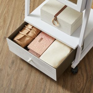 Este armario joyero mezcla líneas limpias y marcos de acero industrial con un acabado blanco, aportando una calidez y atractivo atemporal a cualquier espacio. Su estructura móvil con 4 ruedas facilita el traslado de una habitación a otra, mientras que el gran espejo te permite revisar tu atuendo de pies a cabeza.