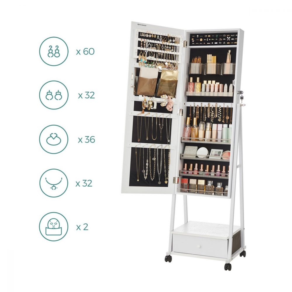 Con 92 lugares para pendientes, 36 ranuras para anillos, 1 varilla para brazaletes, y 32 ganchos para collares, este armario garantiza que cada pieza de tu colección tenga su lugar. Además, cuenta con 2 bolsas para mascarillas, una bandeja de brochas con 3 ranuras, una barra de labios de 10 ranuras, y 4 estantes adicionales, rodeando todos tus secretos de belleza.