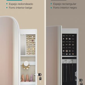 Espejo y Luz Incorporados: El espejo incorporado dentro del armario es ideal para maquillarte o para ajustes de último minuto en tus joyas. Además, la luz LED incorporada asegura una visibilidad óptima incluso en condiciones de poca luz, lo que hace que sea más fácil encontrar y seleccionar tus accesorios.