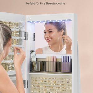 Iluminación LED Interior: Equipado con 6 luces LED, este organizador ilumina tus joyas al abrir la puerta, facilitando la elección de accesorios incluso en la oscuridad, sin necesidad de encender las luces principales y perturbar la paz de tu ser querido.