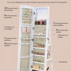 Solución de Almacenamiento Integral: Con 120 ranuras para pendientes, 54 agujeros para pendientes de botón, 18 ganchos para collares, 91 ranuras para anillos, 3 barras para pulseras, además de 3 compartimentos, 2 cajones y 4 estantes, este armario pone fin al desorden de tus joyas y accesorios.