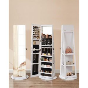 Solución de Almacenamiento Integral: Con 120 ranuras para pendientes, 54 agujeros para pendientes de botón, 18 ganchos para collares, 91 ranuras para anillos, 3 barras para pulseras, además de 3 compartimentos, 2 cajones y 4 estantes, este armario pone fin al desorden de tus joyas y accesorios.