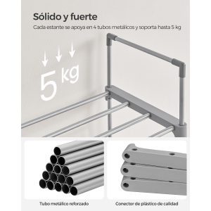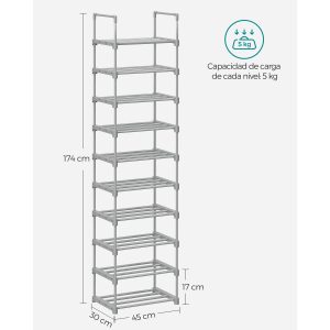 Empieza una vida organizada con este zapatero de 10 estantes de diseño compacto, que aprovecha al máximo los espacios estrechos. Su construcción de metal proporciona un sólido apoyo para tus zapatos, con una capacidad máxima de carga estática de hasta 5 kg por estante.