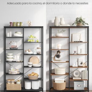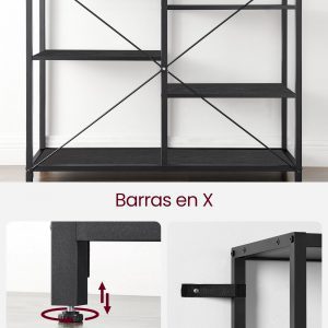 Estabilidad y Seguridad: Reforzada con barras en X en la parte trasera para aumentar su estabilidad, cuenta con pies ajustables que permiten equilibrar la estantería incluso en suelos irregulares. Además, el dispositivo de fijación incluido previene el riesgo de vuelco, garantizando la seguridad en cualquier entorno.