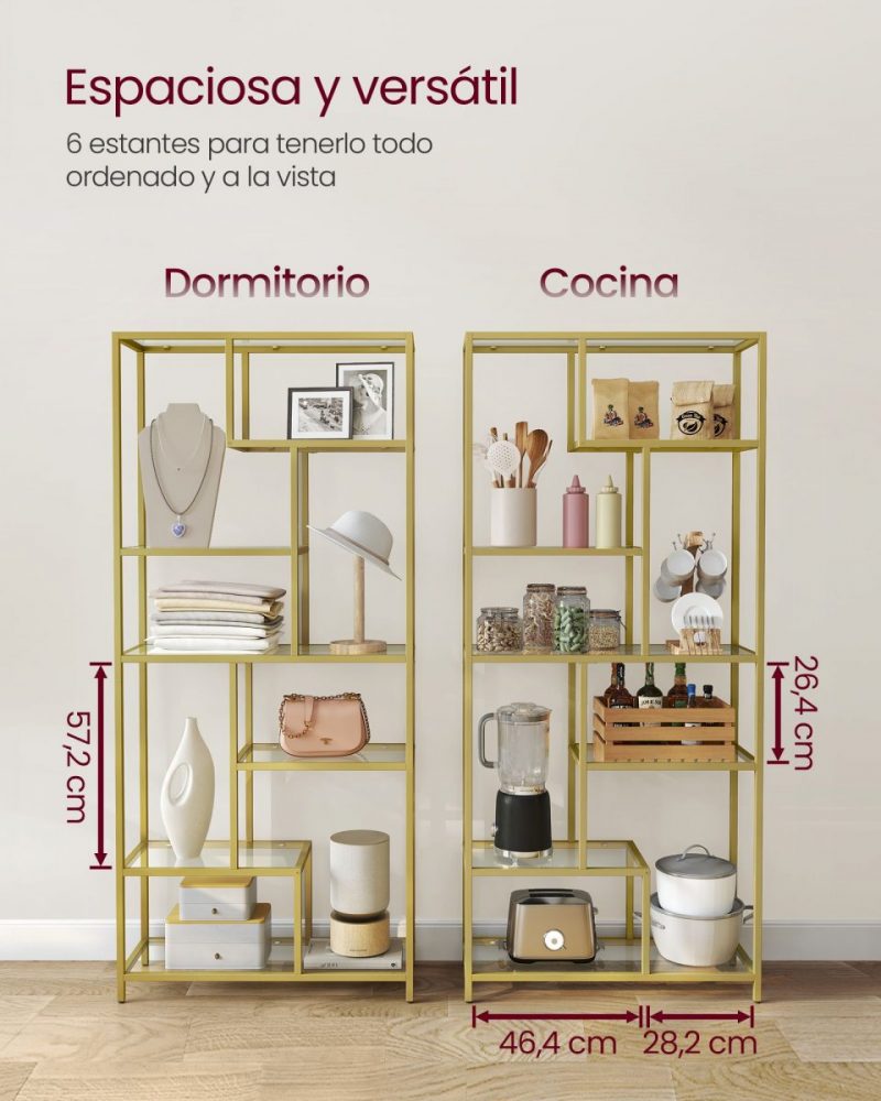 Ya sea en el estudio, el salón o la cocina, esta estantería es increíblemente versátil. Utilízala para almacenar libros y revistas en tu estudio, exhibir trofeos y adornos en el salón, o para organizar botellas y tarros en la cocina. Las posibilidades son infinitas.