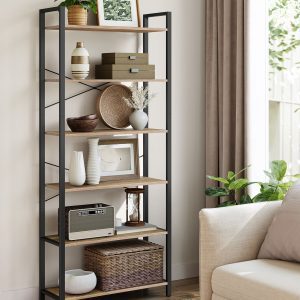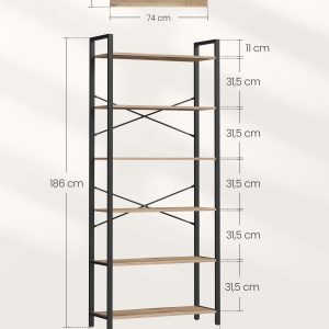Amplio Espacio para Cualquier Habitación: Con seis estantes abiertos de 30 x 74 cm, esta estantería proporciona mucho espacio para exponer libros, adornos, plantas y otros objetos decorativos. Sus dimensiones de 30 x 80 x 186 cm la hacen perfecta para cualquier habitación de la casa.