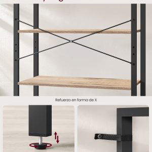 Aporta un Aire Industrial: La combinación de color marrón camello y negro ébano le da a esta estantería un estilo industrial que se adapta perfectamente a cualquier decoración moderna. Es la pieza perfecta para dar a tu hogar una actualización instantánea y sofisticada.