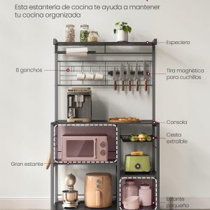 Transforma tu cocina en un espacio de eficiencia y estilo con nuestra estantería multifuncional. Diseñada pensando en la funcionalidad y la estética, esta estantería no solo maximiza tu espacio de almacenamiento sino que también hace que cocinar sea más agradable y ordenado.