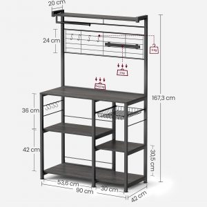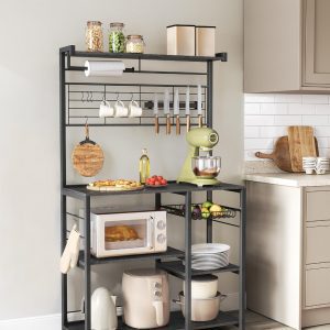 Amplio Espacio de Almacenamiento: Organiza especias en el estante superior, cuelga sartenes y utensilios en los 12 ganchos y utiliza la superficie amplia para electrodomésticos como cafeteras, tostadoras y microondas. Todo diseñado para que cocines con eficiencia.