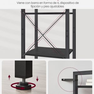La estabilidad es clave en cualquier mueble, y esta librería lo tiene todo. Equipada con patas ajustables, se mantiene firme y recta incluso en superficies irregulares, mientras que su diseño en forma de X refuerza su capacidad para sostener hasta 50 kg. Es la combinación perfecta de belleza y fuerza, ofreciendo un soporte fiable para tu biblioteca personal.