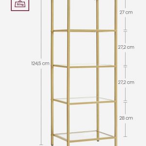 Optimización del Espacio: Con dimensiones compactas de 30 x 40 cm y una altura de 124,5 cm, esta estantería de cristal maximiza el almacenamiento vertical sin ocupar mucho espacio en el suelo, perfecta para ambientes reducidos.