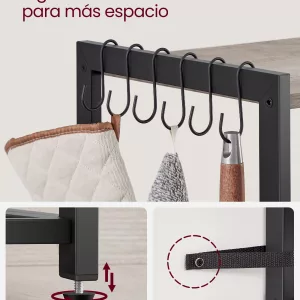 Almacenamiento Práctico y Eficiente: Equipada con 2 cestas de malla de 9 cm de profundidad, perfectas para almacenar frutas y verduras frescas, y 6 ganchos laterales para colgar utensilios de cocina como cucharas, espátulas y trapos. Esta estantería te ayuda a mantener tus ingredientes y herramientas organizados para facilitar la preparación de tus comidas.