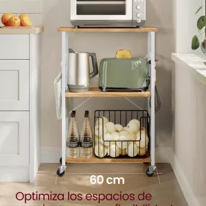 Diseñada pensando en la funcionalidad y la eficiencia, esta estantería no solo ofrece un hogar para tu microondas sino también espacio adicional para otros utensilios de cocina. Con unas dimensiones inteligentes de 40 x 60 x 89 cm y estantes espaciados en 38 cm, su diseño compacto se adapta perfectamente a espacios reducidos, brindando un aspecto organizado y estilizado a tu cocina.