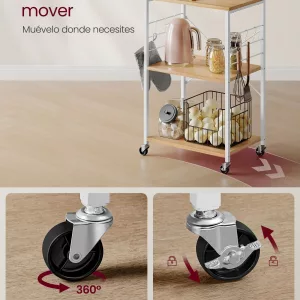 Movilidad sin Esfuerzo: Equipada con 4 ruedas universales, de las cuales 2 cuentan con freno, esta estantería se puede mover fácilmente a cualquier parte de tu cocina. La flexibilidad de detenerla en cualquier lugar permite una cocina más dinámica y adaptativa.
