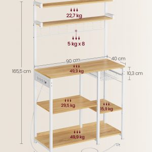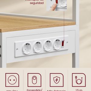 Conectividad y Seguridad: Equipada con una toma de corriente que incluye 4 salidas de CA, nuestra estantería ofrece protección contra sobrecargas y fugas, junto con un interruptor de encendido/apagado, garantizando una alimentación segura para tus electrodomésticos y dispositivos.