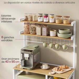 Nuestra estantería de cocina no solo ofrece soluciones prácticas de almacenamiento y carga, sino que también añade un toque de elegancia a tu espacio. Es la adición perfecta para cualquier cocina moderna, proporcionando un centro de organización y carga eficiente.