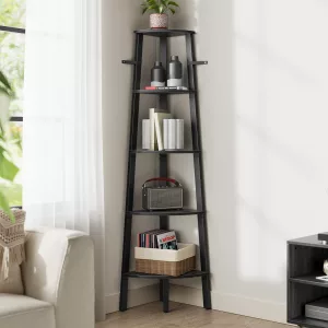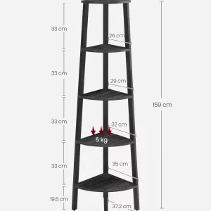 Optimización del Espacio: Con un tamaño compacto de 37,2 x 37,2 x 159 cm, esta estantería aprovecha inteligentemente los espacios angulares, brindando almacenamiento en 5 niveles para tus objetos de decoración, plantas, marcos de fotos y libros.