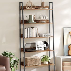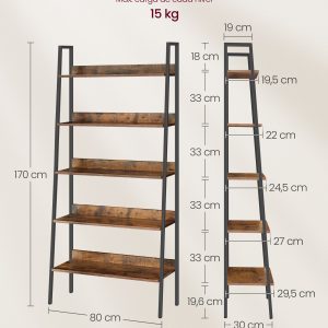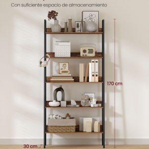 Maximiza tu espacio con nuestra Estantería Estrecha de Escalera para Espacios Reducidos. Diseñada para ocupar solo 30 x 80 cm en el suelo, esta estantería aprovecha al máximo el espacio vertical con sus 170 cm de altura y 5 estantes, haciendo que sea perfecta para áreas pequeñas. Su diseño elegante con tableros negros ébanos y un marco robusto la convierten en una pieza versátil y atractiva para cualquier habitación.