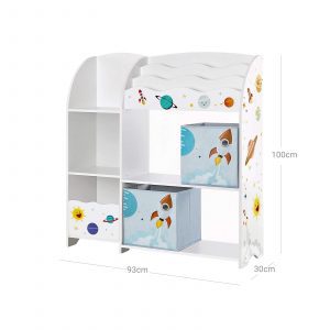 El diseño de esta estantería, con sus alegres pegatinas de cohetes, asteroides y estrellas, no solo ilumina el espacio de los niños, sino que también estimula sus imaginaciones. Es un mueble que combina funcionalidad con un toque lúdico y educativo.