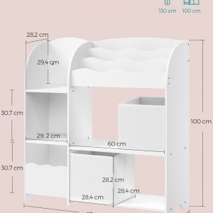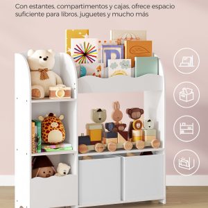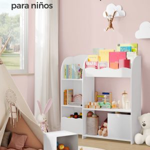Estabilidad y Durabilidad: Fabricada con tablero de aglomerado de alta calidad, esta estantería es robusta y duradera, capaz de soportar el uso diario y mantener seguros los tesoros de tus pequeños.