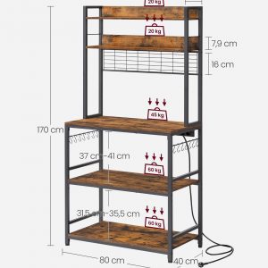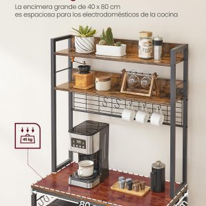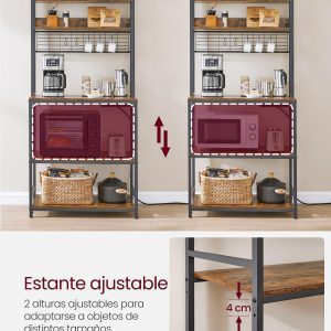 El estante central (carga de 59 kg) de esta estantería cocina se puede ajustar hacia arriba o hacia abajo en 4,1 cm para adaptarse a los aparatos de diversos tamaños, desde una pequeña tostadora a tu licuadora y microondas.