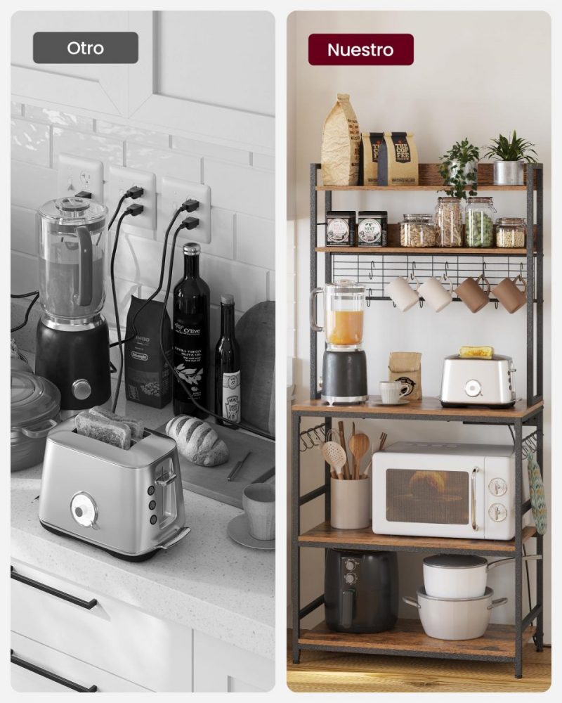 5 estantes para tu microondas, cafetera, freidora de aire y otros electrodomésticos, 14 ganchos en forma de S para colgar tus tazas o cucharones en el panel de alambre o barras laterales – esta estantería de cocina libera tu espacio.