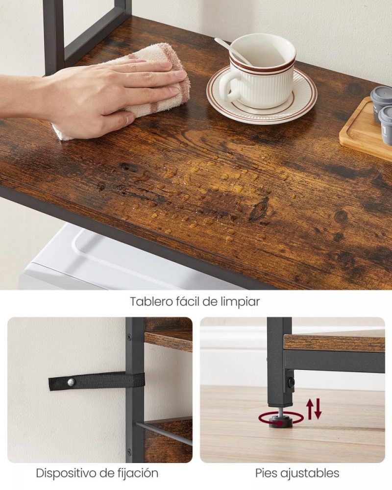 El tablero de aglomerado y el marco robusto de acero hacen un soporte para microondas elegante y robusto que eleva tu espacio y soporta hasta 274,5 kg. Y los pies ajustables y el dispositivo de fijación mejoran la estabilidad.