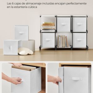 Dimensiones Versátiles: Dos configuraciones posibles de la estantería (64 x 31,5 x 95,5 cm) con cubos de 30 x 30 x 30 cm y cajas de 26 x 26 x 28 cm.