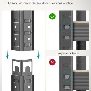 Seguridad y Estabilidad: Incluye bordes doblados, tapas de plástico y un kit anti-vuelco para asegurar que tu estantería se mantenga segura y estable en cualquier entorno.