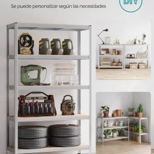 Durable y Estable: Fabricada con un sólido marco de acero y estantes de MDF (Tablero de Fibra de Densidad Media), cada estante puede soportar hasta 175 kg. El dispositivo de fijación incluido permite asegurar la estantería a la pared, garantizando una mayor estabilidad y seguridad.