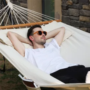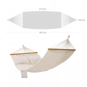 Detalles: – Material: 70% algodón, 30% poliéster, 300 gr/m² – Tamaño de la lona: unos 210 x 150 cm (Largo x Ancho) – Longitud total: 300 cm – Almohadilla: 60 x 40 cm – Barra de madera: 120 x 3,2 x 2,2 cm – Carga máxima: 300 kg Entrega: – 1 x Hamaca – 2 x Almohadilla – 1 x Bolsa de transporte