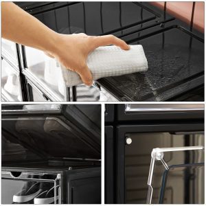 Nuestras cajas de zapatos destacan por su puerta frontal transparente, que permite un fácil acceso a tus pares favoritos sin necesidad de desplazar otras cajas. El diseño ingenioso incluye un recorte superior que funciona como mango y un orificio de ventilación para mantener tus zapatos frescos, libres de humedad y olores.