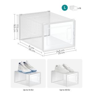 Amplia Capacidad: Con dimensiones internas de 31 x 24,5 x 17,5 cm, estas cajas son adecuadas para zapatos hasta la talla 46. Perfectas para zapatillas deportivas, tacones altos, zapatos planos y más.
